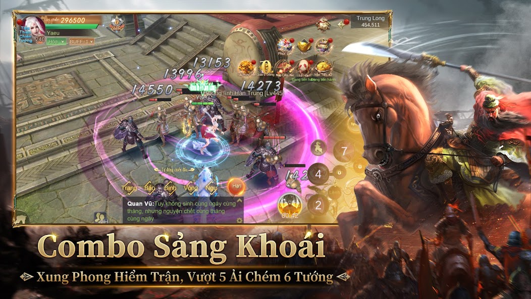 Liên kích Combo cực đã, phối hợp hiệu ứng chiến đấu tinh tế, dễ dàng chìm đắm trong trận chiến, cho phép bạn tung hoành trên chiến trường ngàn quân, đại sát bốn phương, trải nghiệm cảm giác sảng khoái như Chiến Thần “Thần chặn diệt Thần, Phật chặn diệt Phật”, xưng bá sa trường!