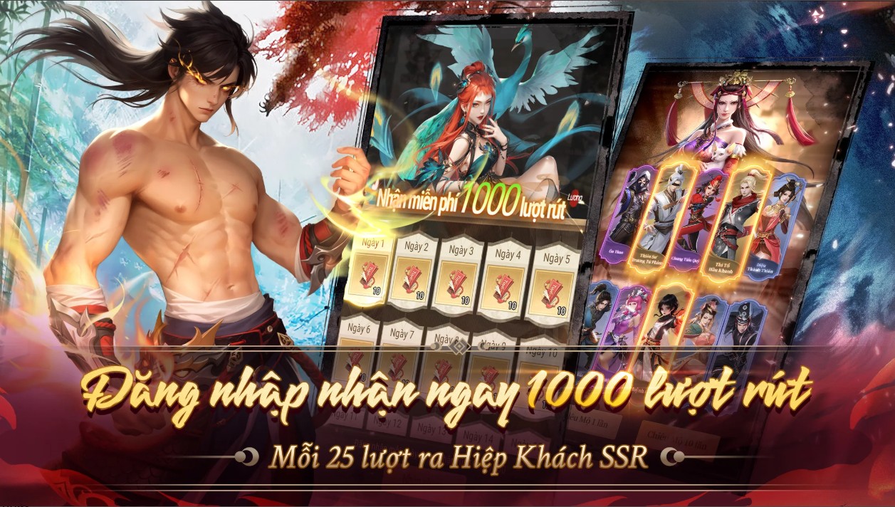 Đăng nhập tặng ngay 1000 lượt quay, điểm danh còn tặng Hiệp Khách Tự Chọn Cam. Không cần phải lo lắng không thể phối hợp đội hình như ý muốn!